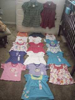 My goal for this morning was to make it to the mall to spend my JCPenney gift card that my mother gave me for my birthday. We were finally out the door at 10:30 (anyone else have a 2yr old and newborn?) I was able to get two shirts that will fit me. I had a little bit left on the card to spend so I ventured to the baby section and scored 16 pieces for my DD for .97 each! I got mostly size 2T and 3T so it will be a few years before she’ll wear them, but worth hanging onto at this price. Won’t she be simply adorable? By purchasing several tops at one time I also will have less shopping to do once she needs a new size- simply pull out the tub of clothes she has yet to grow into and go “shopping” all over again-without the trip to the store, gas used, and money spent. Doesn’t get better than that!