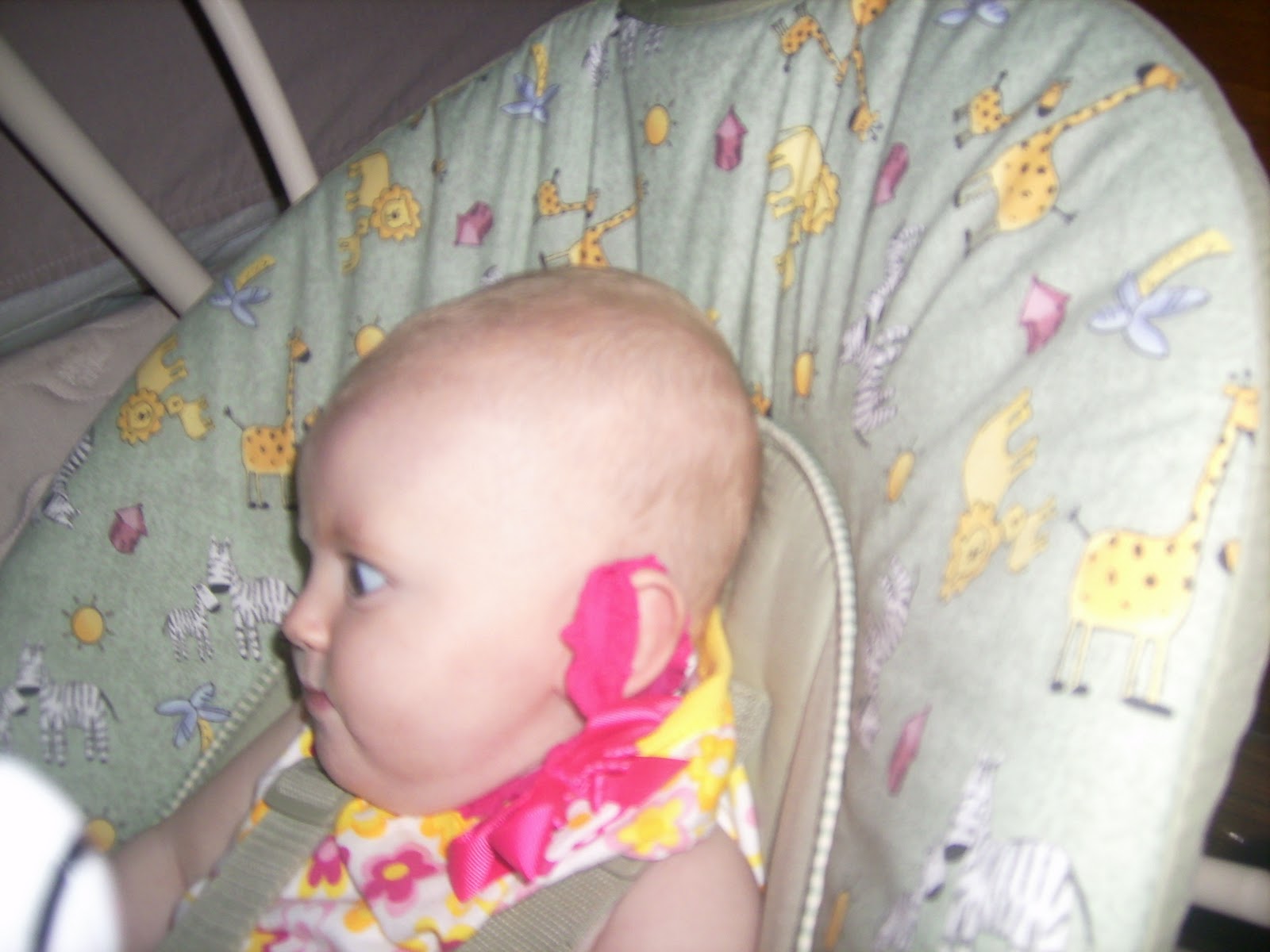 One day last week Little One was wearing this cute little pink bow. For once it actually stayed on so I thought nothing of it when I put her in the swing later on for a nap. She went to sleep easily but cried out several times during the nap. I was so frustrated, but when I went in to wake her up I dissolved into laughter. I couldn’t help myself. Here’s what I found: