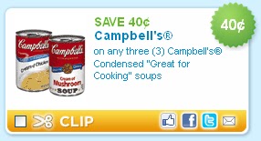 This week Walgreens has an in ad Q (limit 3) to get Campbell’s for $.79 and I’m planning to combine it with this $.40/3 Campbell’s printable to get them for $.66 each.  Nothing spectacular, but it will help tide me over until the beginning of November and we see the Thanksgiving sales come around (expect to see them for $.50-$.60 sale price then) Be sure to get a raincheck if they’re out of stock, so you can use it another week.