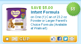 A $5 coupon on formula is comparable to about a 20% off sale, which is huge on formula! The average 6 month old can go through one $25 can in about 4 or 5 days. If you know anyone with a baby on formula I’m sure they would appreciate this coupon for $5 off Parents Choice Infant Formula.