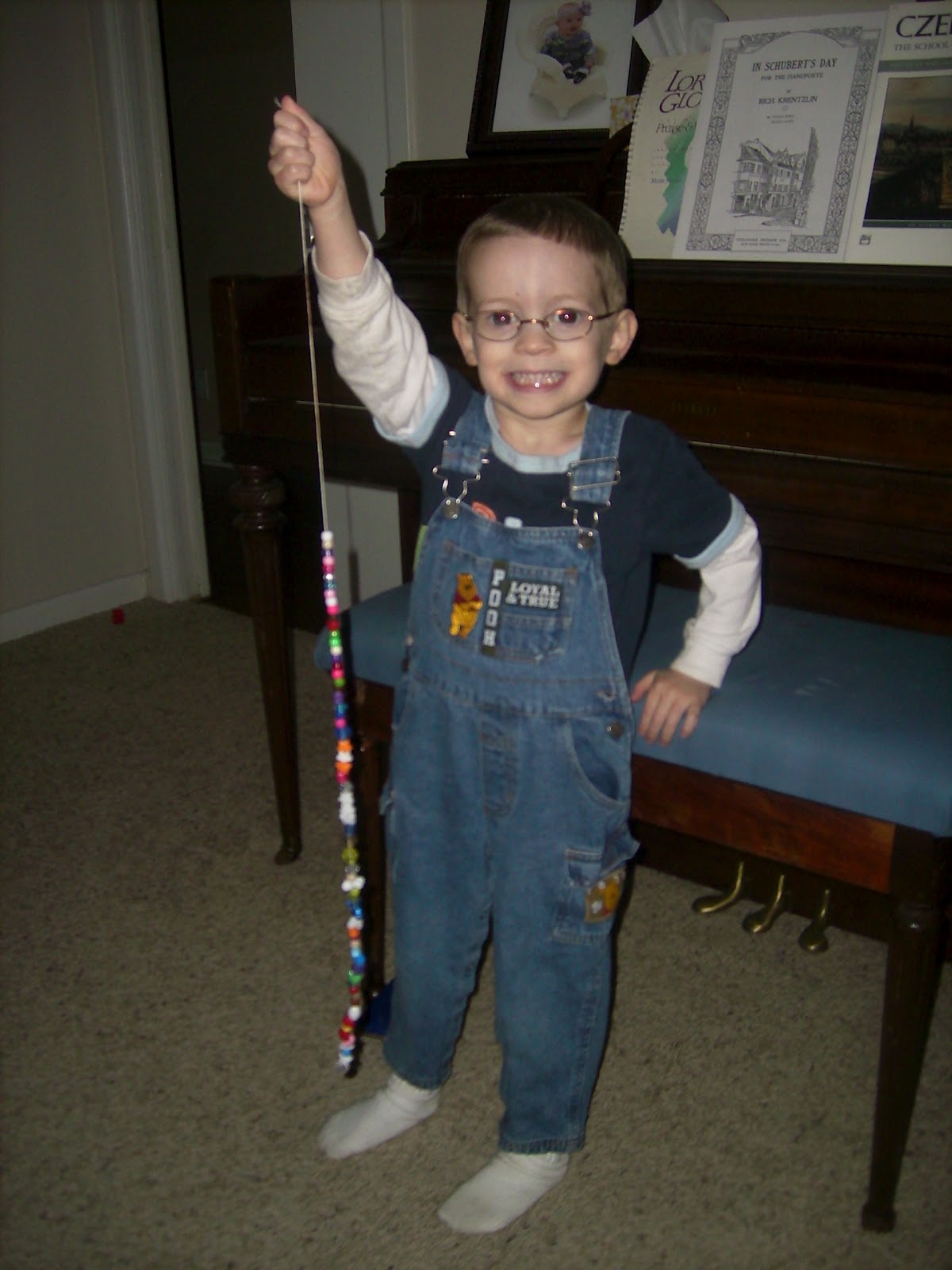 This week we started with stringing beads. I gave him a bowl of assorted beads and a string with a starter bead. He enjoyed looking through the various beads and stringing them. Once he got going he was really excited about how long it was. Next time I plan to show him how to make patterns. He can choose to do patterns according to color or shape- or both!