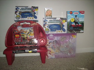 I bought these items and used all the RRs that I earned from the Right Guard and Coke. The only things I’m not sure about keeping are the Sega games. I may end up taking them back tomorrow- we’ll see. There were tons of make up play sets, foam puzzle blocks, books, games, action figures, coloring sets and more. There were 2 of the big cardboard play houses that the kids can color themselves for $5, but one sold right ahead of me. I also noticed some Broadway nail kits for $1.50. That SAVE $1.00 off Kiss® & Broadway Nails® Artificial Nail Products, offer excludes glue & nail files is still available to make them just $.50 each. There were Goody hair bands for $.50 also. I think there were 7 carts total- and one is that huge blue dolly!