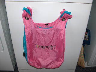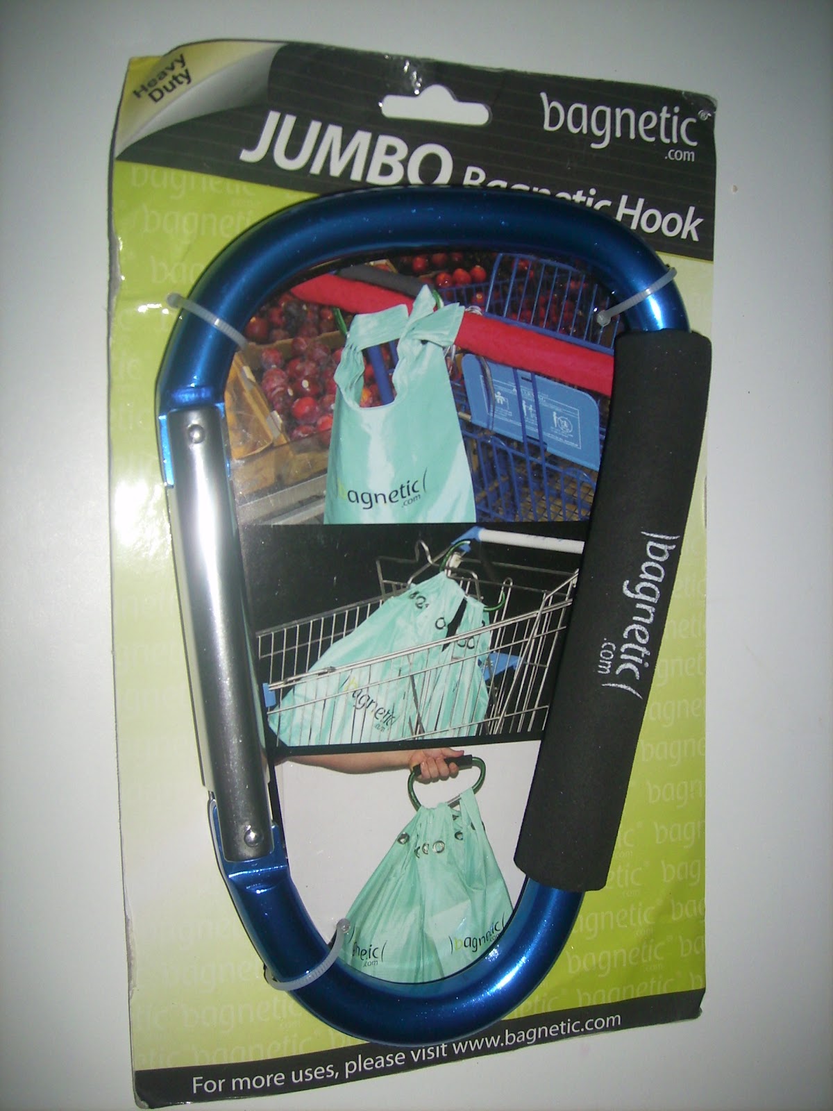 The last Bagnetic product I have is a jumbo carabiner clip for carrying the loaded bags or storing them.  Honestly I haven’t found this to be a useful product for me.  I typically only shop from the sale ads (excluding milk, bread and bananas) Consequently most shopping trips don’t yield a lot of purchases – especially heavy ones.  On the rare occasion that I do buy a large quantity of items, my husband will carry them inside the house in one load before I can get them hooked on the clip.  Let’s just say that most 5th graders are bigger than me, and very few adults are bigger than him and leave it at that 😉  As far as storing the bagnetic bags on the clip, I felt this was an unneccessary step. They stay nicely on my dryer until I take them out to the van and they stay hooked together well in the van.  While a good idea, the jumbo clip just isn’t practical for us. It probably works well for those without laundry rooms on the way out to the garage.