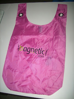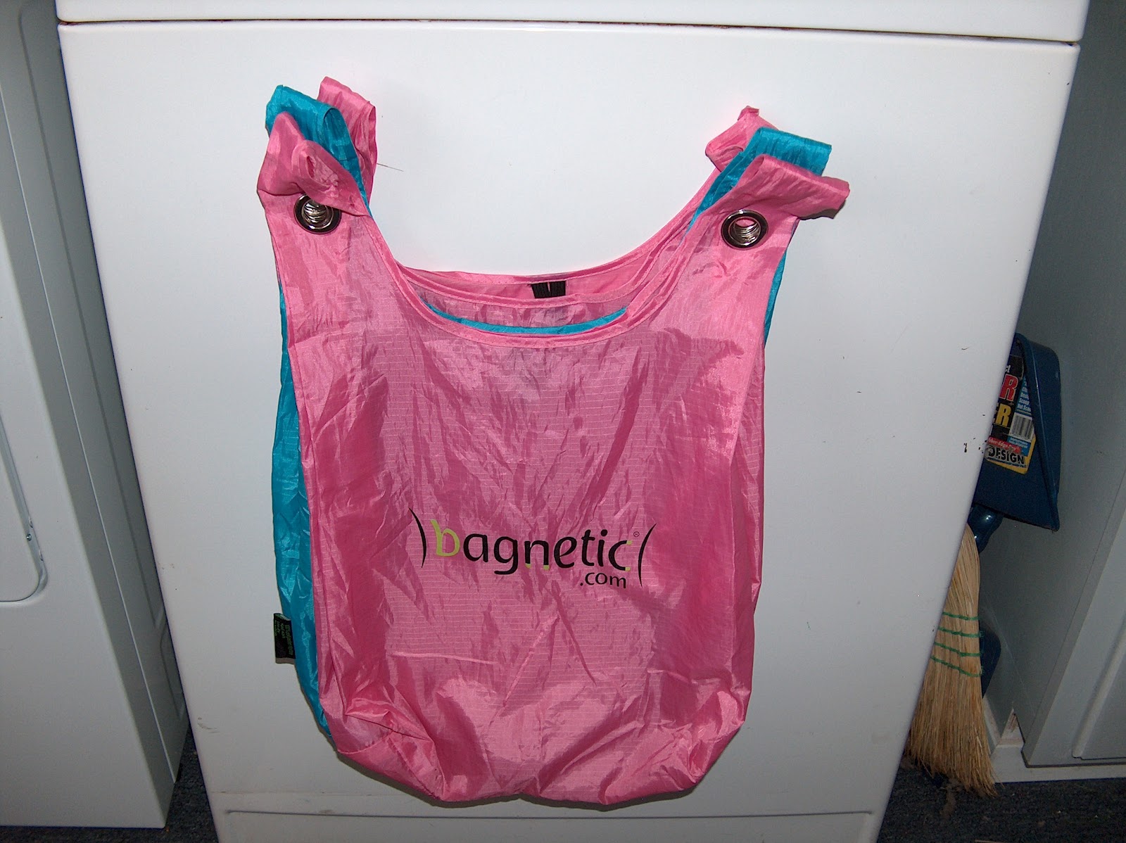Bagnetic bags are designed to be used on the plastic bag racks at the stores.  The metal rings are magnetic and there is an extra hook on the back, so when one side of the bag is pulled forward for loading, the back side will stay on the rack. So far every cashier I’ve had has loved them (and I’ve been using them for 6 months now!)  Several have even asked where they could buy them at for themselves :-)  We all know how much cashiers abhor reusable bags, so this is a pretty convincing product. I love them because:
