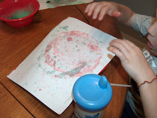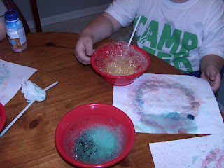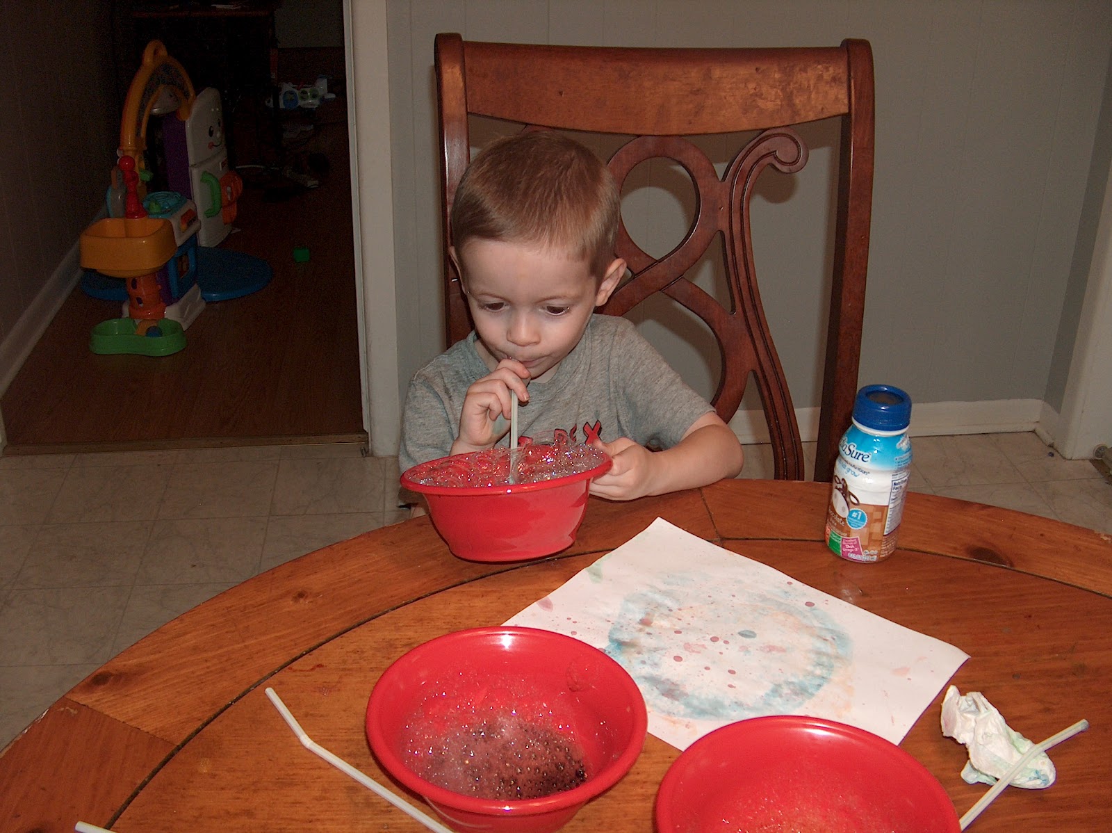 I knew the 2 year old wouldn’t be able to handle the straw and blowing, so I would blow the bubbles for him sometimes and sometimes the other kids would. He did good pressing his paper down.