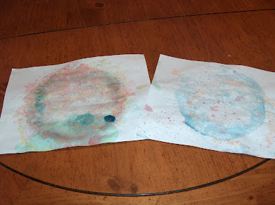 My last 2 years of teaching Kindergarten music I co-taught with the art teacher next door. I saw some really neat art projects and painting bubble art was one of them. I had to make do with just food coloring instead of tempera paint, but it worked for our project.