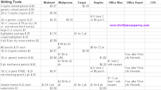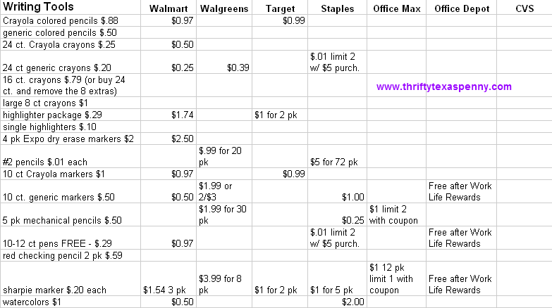 This summer I’m going to approach the school supply sales differently. I’ve created a spreadsheet with my “match it or beat it” price for each item. Each week I’ll enter the prices from the sale ads for the 7 national stores in the East Texas area. You’ll be able to look at each item you’re needing to buy and see which store has the best price. You can also see which store has the best sale prices for that week overall. Walmart prices are set for the summer and I’ll add the rest of them to the list when I make it back to check prices again.