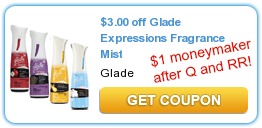 Glade Expressions Mists will be on sale for $2.99 with a $1 RR back. Use this $3 Glade Expressions printable (it will be reduced to $2.99 at the register) to pay nothing and get a $1 RR back. I do love a nice moneymaker