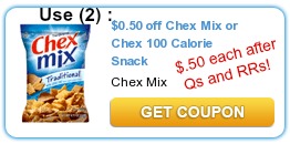 Chex Mix will be on sale 2/$3, also with a $1 RR back. Use (2) of this $.50/1 Chex mix printable to pay $2 at the register and get $1 RR back making them just $.50 a bag!