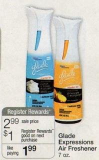 Glade Expressions Mists will be on sale for $2.99 with a $1 RR back. Use this $3 Glade Expressions printable (it will be reduced to $2.99 at the register) to pay nothing and get a $1 RR back. I do love a nice moneymaker