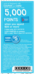 Some regions of the country have a Buy $25, get 5,000 points promotion in their ad valid for Sunday – Tuesday only.  Ours was on the front buy25 get 5000 ptspage. This will be $25 after all Walgreens discounts and Walgreens coupons, but before you use any manufacturer coupons :-)  Be sure to have this coupon scanned before any manufacturer coupons and then to check your receipt after the transaction to be sure you received your points!
