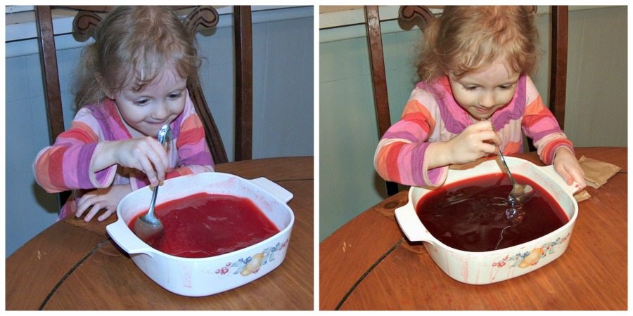 It melted easily into the hot water/juice mixture. Little One had a blast (as you can see by the red splashes all over the dish and table) getting to stir in the jello and sauce!