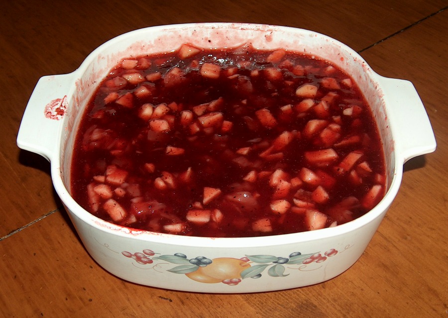 Usually when I mix the pineapple tidbits and apple chunks into the jello and cranberry sauce, everything will sink to the bottom – even if I wait a couple of hours after gelling. This time because of that nice, thick and rich sauce the fruit incorporated very well throughout and didn’t sink.